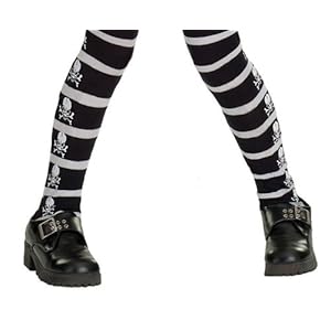 Product Description : Size: SmallBlack and white striped tights are complimented by white skull and crossbones up the sides of the tights. Great for a goth or evil doer costume!