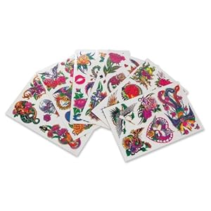 Product Description : This assortment of glitter tattoos contains fun temporary tattoos of colorful flowers, birds, butterflies, skulls, hearts, lips and other fun body art. These sparkly tattoos are great for goody bags, party favors and carnival prizes.